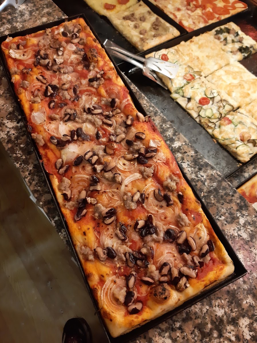 Great local pizzeria and pinseria. Certified Pinsa Romana place. Pizza/Pinsa made to order (15min wait) or available in ready to go slices (popular with the locals for quick snack) Very good price, helpful service with basic English.